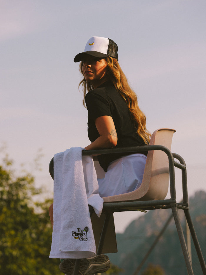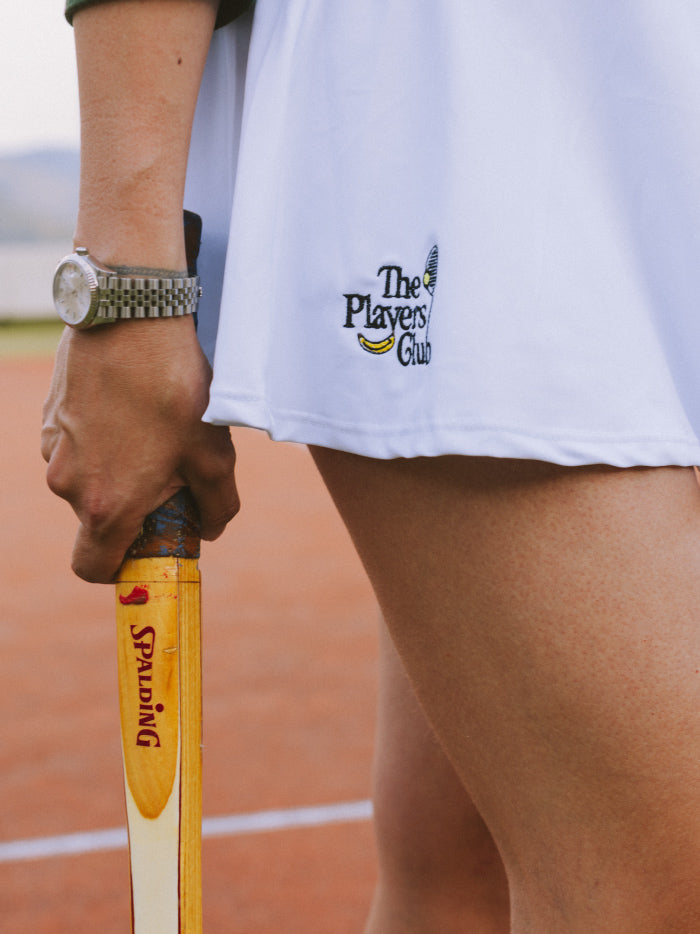 Maglietta nera leggera e traspirante • Gonna bianca con pantaloncini integrati • Spacchi laterali per movimenti fluidi e dinamici • Calzini taglia unica in cotone con bande nere • Logo TPC e Banana ricamati