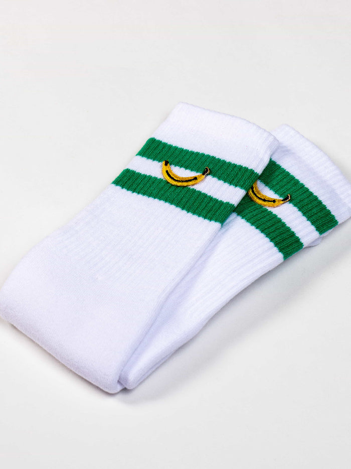 Chiudono il set le Grip Socks bianche, con bande verdi e la banana ricamata come marchio di fabbrica. L’essenziale, ma con personalità.